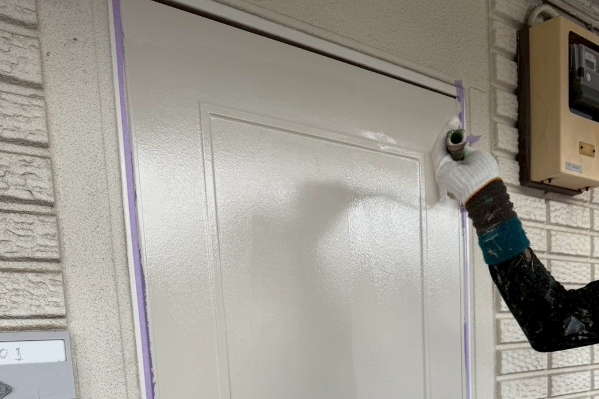今回の現場では、集合住宅の共用部にあたる玄関ドアの塗装工事を行いました。